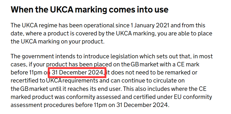 An additional year of transition time for companies to start using the UKCA mark (the new product safety mark for the UK).